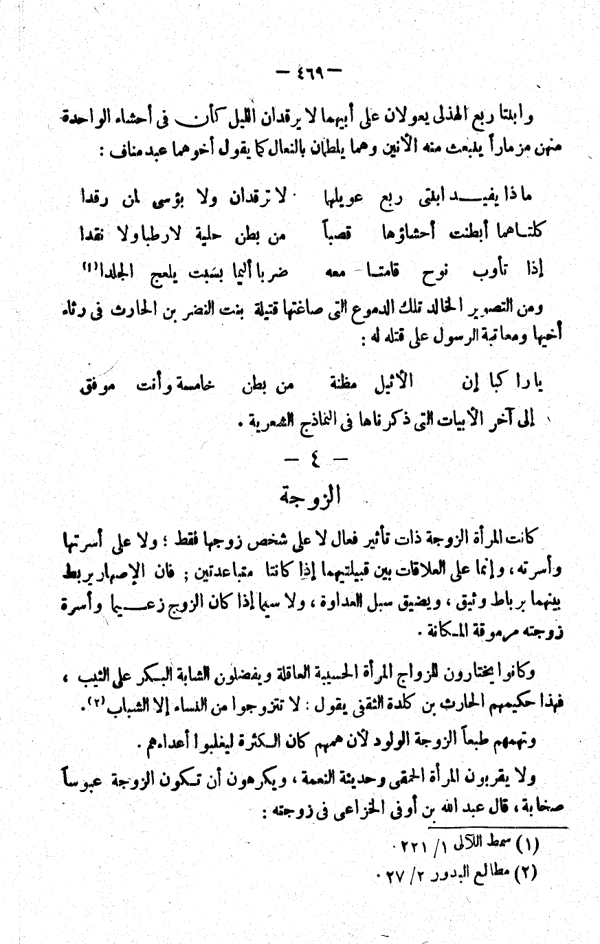 وابنتا ربع الهذلي تعولان على أبيهما لا ترقدان الليل, كأن في أحشاء الواحدة منهن مزمارا ينبعث منه الأنين, وهما تلطمان بالنعال, كما يقول أخوهما عبد مناف: