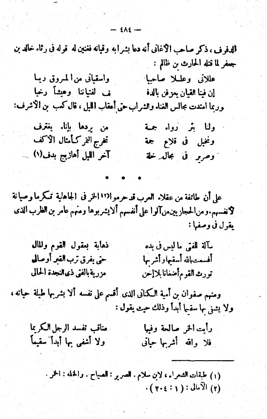 على أن طائفة من عقلاء العرب قد حرموا2 الخمر في الجاهلية؛ تكرما وصيانة لأنفسهم. ومن الحجازيين من آلوا على أنفسهم ألا يشربوها, ومنهم عامر بن الظرب الذي يقول في وصفها:
