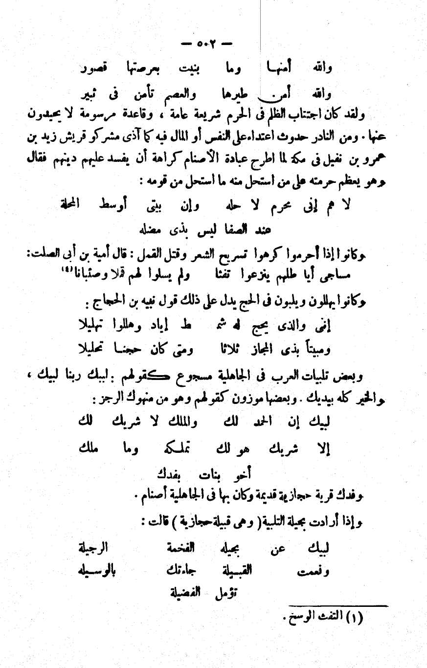 وبعض تلبيات العرب في الجاهلية مسجوع؛ كقولهم: لبيك ربنا لبيك، والخير كله بيديك. وبعضها موزون كقولهم, وهو من منهوك الرجز: