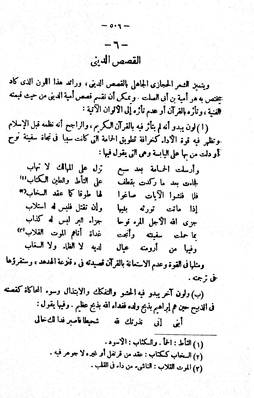 ويتميز الشعر الحجازي الجاهلي بالقصص الديني، ورائد هذا اللون الذي كاد يختص به هو أمية بن أبي الصلت، ويمكن أن نقسم قصص أمية الديني من حيث قيمته الفنية, وتأثره بالقرآن أو عدم تأثره إلى الألوان الآتية: