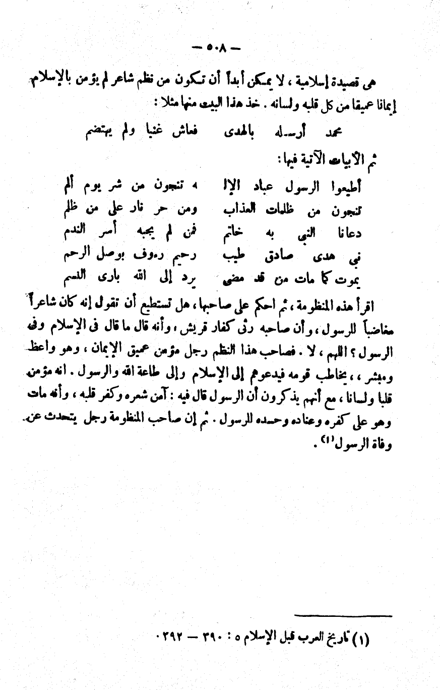 اقرأ هذه المنظومة، ثم احكم على صاحبها، هل تستطيع أن تقول: إنه كان شاعرا مغاضبا للرسول، وإن صاحبه رثى كفار قريش، وإنه قال ما قال في الإسلام وفي الرسول؟ اللهم، لا. فصاحب هذا النظم رجل مؤمن عميق الإيمان، وهو واعظ ومبشر، يخاطب قومه فيدعوهم إلى الإسلام وإلى طاعة الله والرسول. إنه مؤمن قلبا ولسانا، مع أنهم يذكرون أن الرسول قال فيه: "آمن شعره وكفر قلبه" , وأنه مات وهو على كفره وعناده وحسده للرسول. ثم إن صاحب المنظومة رجل يتحدث عن وفاة الرسول1.