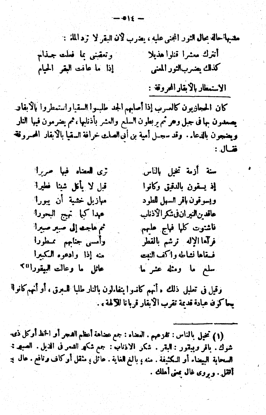 1 تخيل بالناس: تفزعهم. العضاه: جمع عضاهة, أعظم الشجر أو الخمط أو كل ذي شوك. باقر وبيقور: البقر. شكر الأذناب: جمع شكير, الشعر في الذيل. الصبير: السحابة البيضاء أو الكثيفة. منه، بالغ الغاية. عائل: مثقل أو كافٍ ونافع, عال: أثقل. ويروى غال بمعنى أهلك.