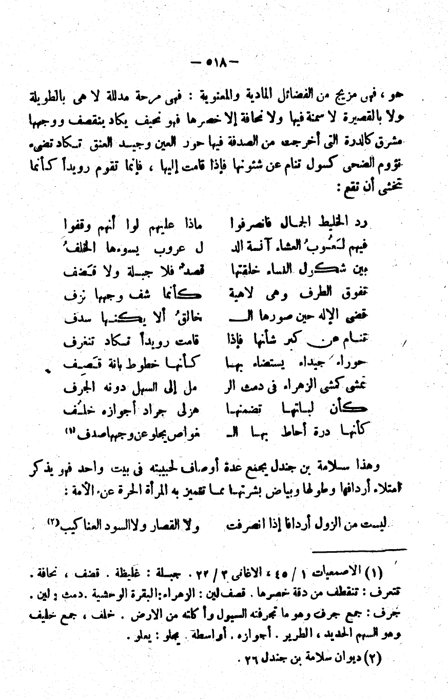 1 الأصمعيات 1/ 45، الأغاني 3/ 22. جبلة: غليظة. قضف: نحافة. تنغرف: تنقطف من خصرها. قصف: لين. الزهراء: البقرة الوحشية. دمث: لين. جرف: جمع جرف وهو ما تجرفته السيول وأكلته من الأرض. خلف: جمع خليف وهو السهم الحديد، الطرير. أجوازه: أواسطه. يجلو: يعلو.