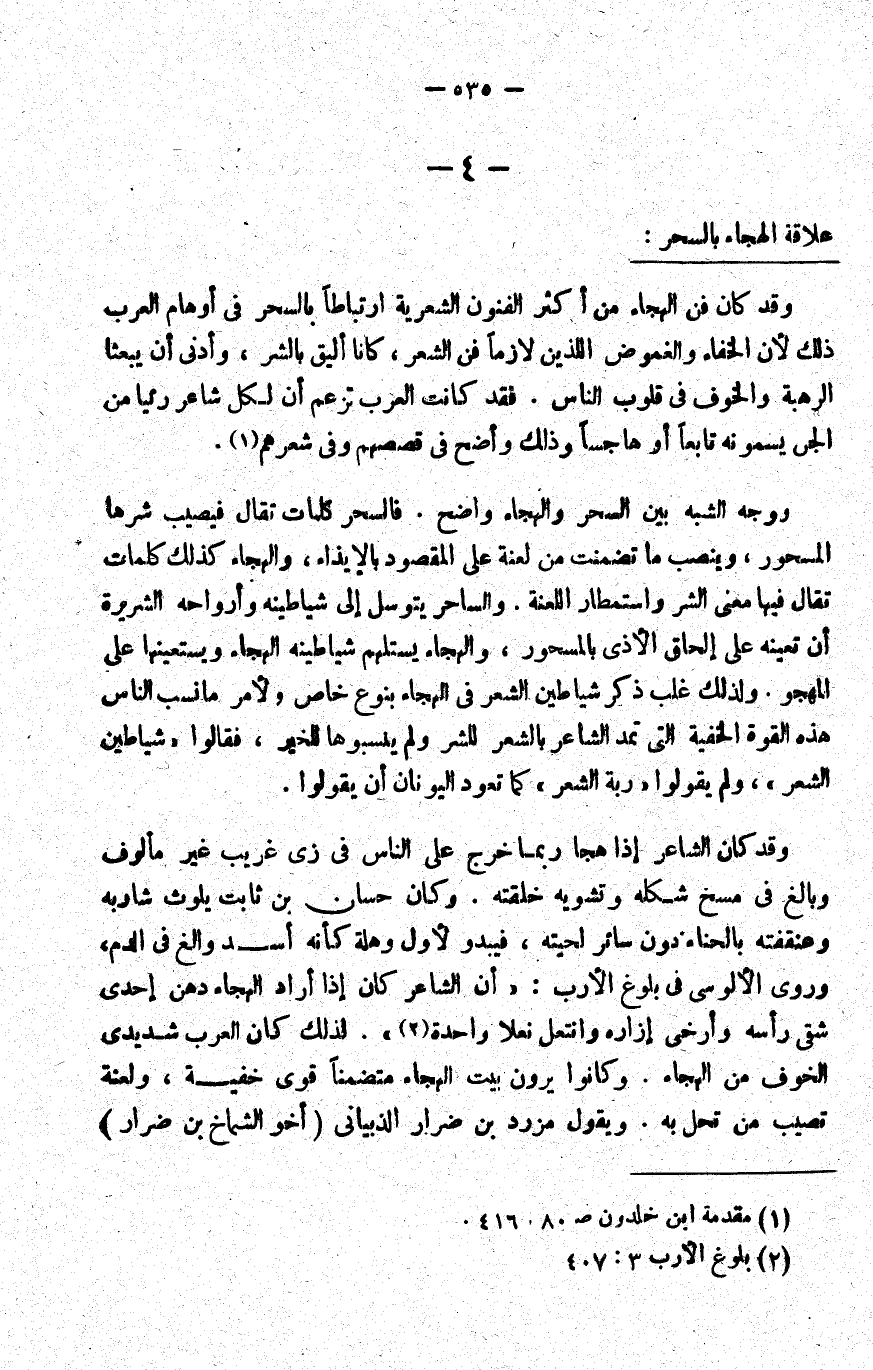 ووجه الشبه بين السحر والهجاء واضح؛ فالسحر كلمات تقال فيصيب شرها المسحور، وينصب ما تضمنت من لعنة على المقصود بالإيذاء، والهجاء كذلك كلمات تقال فيها معنى الشر واستمطار اللعنة. والساحر يتوسل إلى شياطينه وأرواحه الشريرة أن تعينه على إلحاق الأذى بالمسحور، والهجاء يستلهم شياطينه الهجاء ويستعينها على المهجو. ولذلك غلب ذكر شياطين الشعر في الهجاء بنوع خاص ولأمر ما نسب الناس هذه القوة الخفية التي تمد الشاعر بالشعر للشر ولم ينسبوها للخير، فقالوا: "شياطين الشعر"، ولم يقولوا: "ربة الشعر" كما تعود اليونان أن يقولوا.