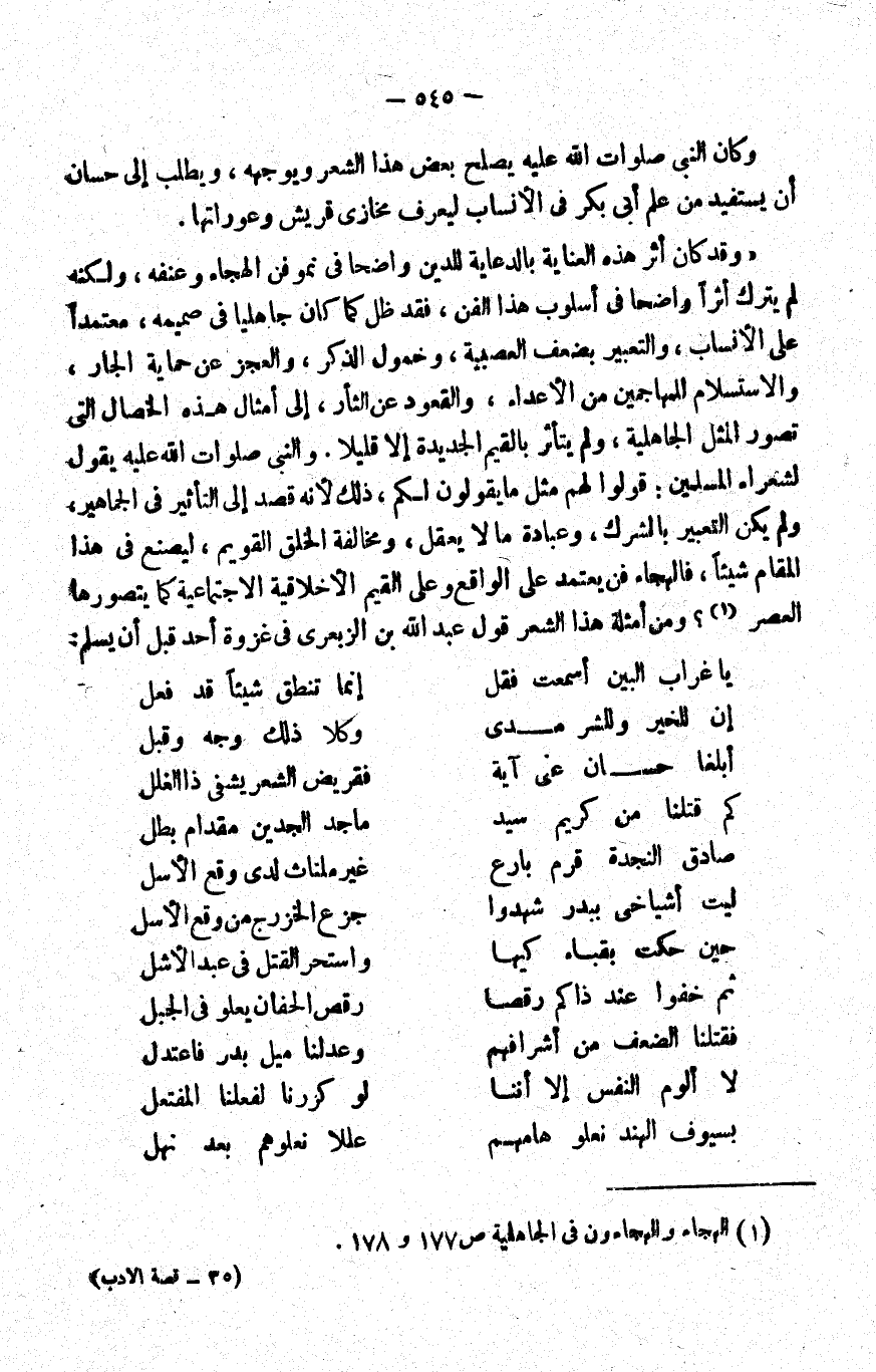 وقد كان أثر هذه العناية بالدعاية للدين واضحا في نمو فن الهجاء وعنفه، ولكنه لم يترك أثرا واضحا في أسلوب هذا الفن، فقد ظل كما كان جاهليا في صميمه، معتمدا على الأنساب، والتعبير بضعف العصبية، وخمول الذكر، والعجز عن حماية الجار، والاستسلام للمهاجمين من الأعداء، والقعود عن الثأر، إلى أمثال هذه الخصال التي تصور المثل الجاهلية، ولم يتأثر بالقيم الجديدة إلا قليلا. والنبي -صلوات الله عليه- يقول لشعراء المسلمين: "قولوا لهم مثل ما يقولون لكم"؛ ذلك لأنه قصد إلى التأثير في الجماهير، ولم يكن التعبير بالشرك، وعبادة ما لا يعقل، ومخالفة الخلق القويم، ليصنع في هذا المقام شيئا، فالهجاء فن يعتمد على الواقع وعلى القيم الأخلاقية الاجتماعية كما يتصورها العصر1. ومن أمثلة هذا الشعر قول عبد الله بن الزبعرى في غزوة أحد قبل أن يسلم: