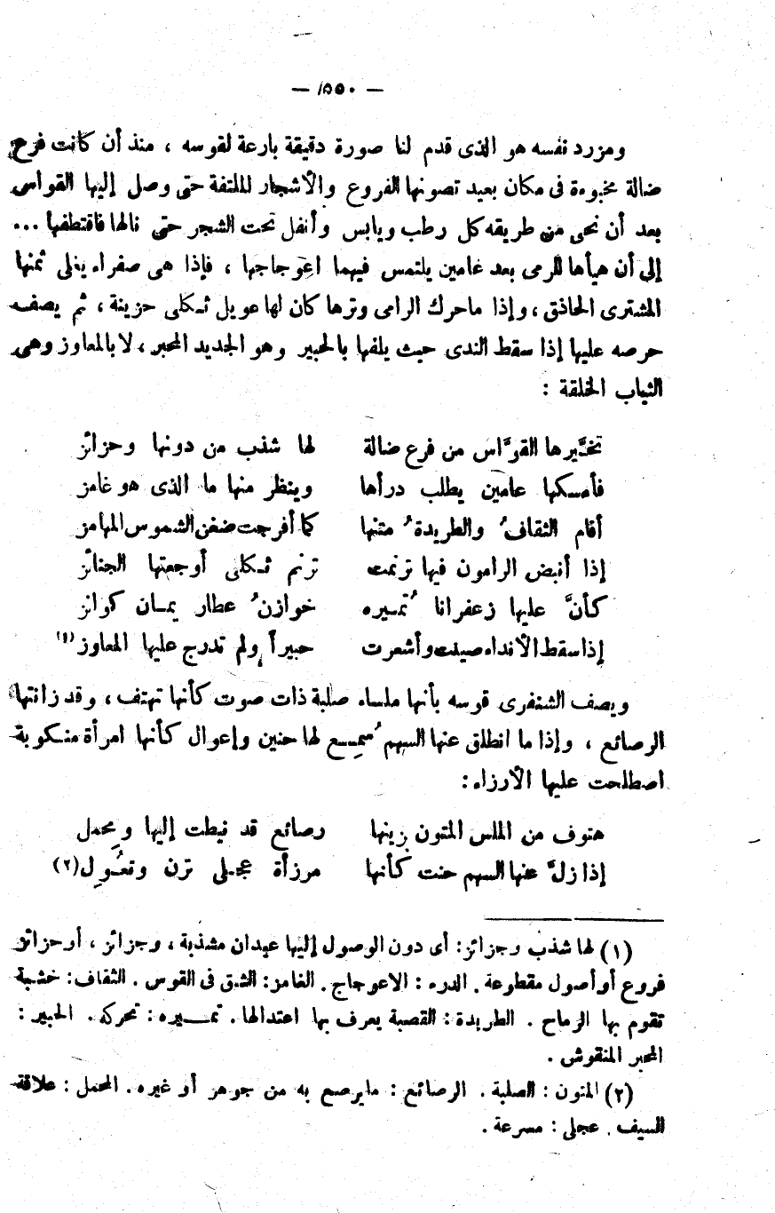 1 لها شذب وحزائز: أي دون الوصول إليها عيدان مشذبة، وجزائز أو حزائز: فروع أو أصول مقطوعة. الدرء: الاعوجاج. الغامز: الشق في القوس. الثقاف: خشبة تقوم بها الرماح. الطريدة: القصبة يعرف بها اعتدالها. تميره: تحركه. الحبير: المحبر المنقوش.