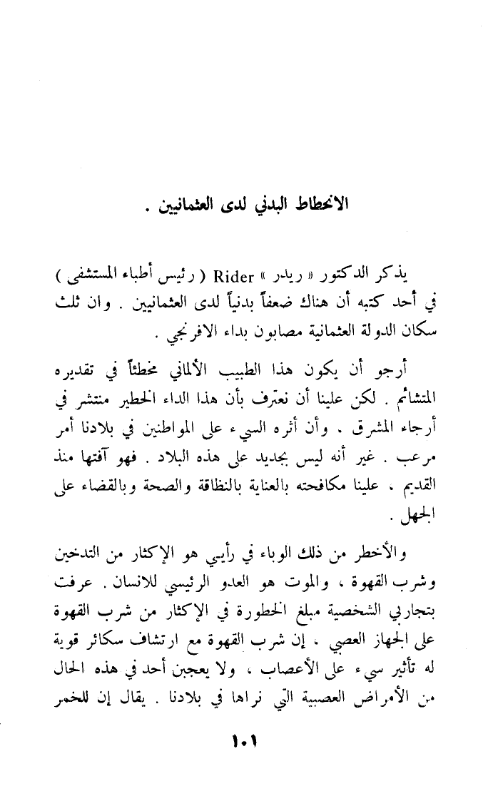 والاخطر من ذَلِك الوباء فِي رَأْي هُوَ الاكثار من التدخين وَشرب القهوة وَالْمَوْت هُوَ الْعَدو الرئيسي للانسان عرفت بتجاربي الشخصية مبلغ الخطورة فِي الاكثار من شرب القهوة على الجهاز العصبي أَن شرب القهوة مَعَ ارتشاف سكائر قَوِيَّة لَهُ تَأْثِير سيء على الاعصاب وَلَا يعجبن أحد فِي هَذِه الْحَال من الامراض العصبية الَّتِي نرَاهَا فِي بِلَادنَا يُقَال أَن للخمر