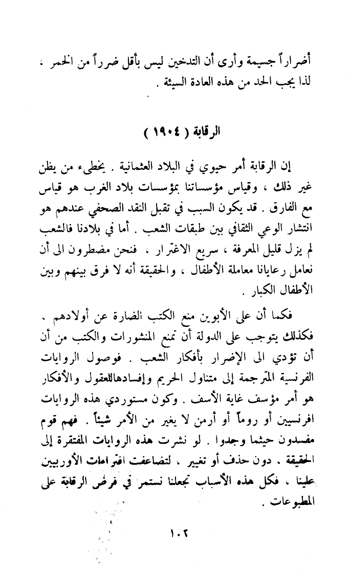 فَكَمَا أَن على الْأَبَوَيْنِ منع الْكتب الضارة عَن أَوْلَادهم فَكَذَلِك يتوجب على الدولة أَن تمنع المنشورات والكتب من أَن أَن تُؤدِّي إِلَى الاضرار بأفكار الشّعب فوصول الرِّوَايَات الفرنسية المترجمة إِلَى متناول الْحَرِيم وافسادها للعقول والافكار هُوَ أَمر مؤسف غَايَة الأسف وَكَون مستوردي هَذِه الرِّوَايَات افرنسيين أَو روما أَو أرمن لَا يُغير من الامر شَيْئا فهم قوم مفسدون حَيْثُمَا وجدوا لَو نشرت هَذِه الرِّوَايَات المفتقرة إِلَى الْحَقِيقَة دون حذف أَو تغير لتضاعفت افتراءات الاوربيين علينا فَكل هَذِه الاسباب تجعلنا نستمر فِي فرض الرقابة على المطبوعات