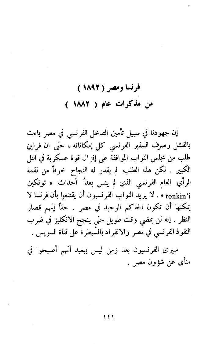 أَن جهودنا فِي سَبِيل تَأْمِين التدخل الفرنسي فِي مصر باءت بالفشل وَصرف السفير الفرنسي كل امكاناتة حَتَّى أَن فراين طلب من مجْلِس النواب الْمُوَافقَة على انزال قُوَّة عسكرية فِي التل الْكَبِير لَكِن هَذَا الطّلب لم يقدر لَهُ النجاح خوفًا من نقمة الرَّأْي الْعَام الفرنسي الَّذِي لم ينس بعد أَحْدَاث (تونكين (لَا يُرِيد النواب الفرنسيون أَن يقتنعوا بَان فرنسا لَا يُمكنهَا أَن تكون الْحَاكِم الوحيد فِي مصر حَقًا انهم قصار النّظر انه لن يمْضِي وَقت طَوِيل حَتَّى ينجح الإنكليز فِي ضرب النّفُوذ الفرنسي فِي مصر والأنفراد بالسيطرة على قناة السويس