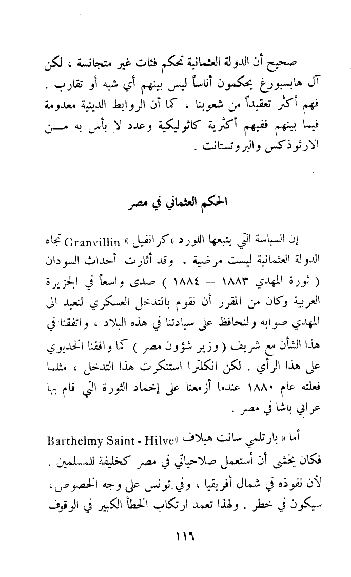 أَن السياسة الَّتِي يتبعهَا اللورد (كرانفيل (تجاه الدولة العثمانية لَيست مرضية وَقد أثارت أَحْدَاث السودَان (ثورة الْمهْدي 1883 1884) صدى وَاسِعًا فِي الجزيرة الْعَرَبيَّة وَكَانَ من الْمُقَرّر أَن نقوم بالتدخل العسكري لنعيد إِلَى الْمهْدي صَوَابه ولنحافظ على سيادتنا فِي هَذِه الْبِلَاد واتفقنا فِي هَذَا الشان مَعَ شرِيف (وَزِير شؤون مصر) كَمَا وَافَقنَا الخديوي على هَذَا الرأى لَكِن انكلترا استنكرت هَذَا التدخل مِثْلَمَا فعلته عَام 1880 عِنْدَمَا أزمعنا على اخماد الثورة الَّتِي قَامَ بهَا عرابي باشا فِي مصر