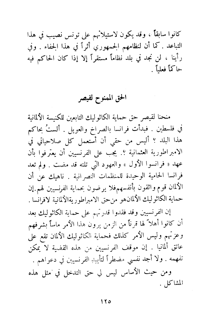 منحنا لقيصر حق حماية الكاثوليك التَّابِعين للكنيسة الألمانية فِي فلسطين فَبَدَأت فرانسا بالصراخ والعويل أَلَسْت بحاكم هَذَا الْبَلَد أَلَيْسَ من حَقي أَن أسْتَعْمل كل صلاحياتي فِي الامبراطورية العثمانية يجب على الفرنسيين أَن يعترفوا بِأَن عهد (فرانسوا الأول (والعهود الَّتِي تلته قد مَضَت وَلم تعد فرانسا الحامية الوحيدة للمنظمات النَّصْرَانِيَّة ناهيك عَن أَن الألمان قوم واثقون بِأَنْفسِهِم فَلَا يرضون بحماية الفرنسيين لَهُم ان حماية الكاثوليك الألمان هُوَ من حق الامبراطورية الألمانية لَا فرانسا