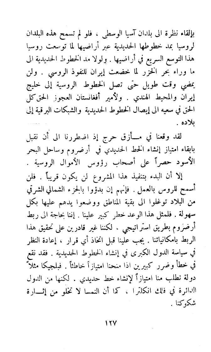 بالقاء نظرة الى بلدان آسيا الْوُسْطَى فَلَو لم تسمح هَذِه الْبلدَانِ لروسيا بِمد خطوطها الحديدية عبر أراضيها لما توسعت روسيا هَذَا التَّوَسُّع السَّرِيع فِي أراضيها وَلَوْلَا مد الخطوط الحديدية الى مَا وَرَاء بَحر الخزر لما خضعت ايران للنفوذ الروسي وَلنْ يمْضِي وَقت طَوِيل حَتَّى تصل الخطوط الروسية الى خليج ايران وَالْمُحِيط الْهِنْدِيّ ولامير أفغانستان الْعَجُوز الْحق كل الْحق فِي سَعْيه الى ايصال الخطوط الحديدية والشبكات البرقية الى بِلَاده