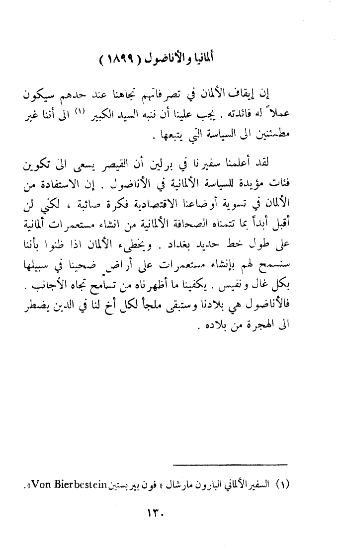 لقد أعلمنَا سفيرنا فِي برلين أَن القيصر يسْعَى الى تكوين فئات مؤيدة للسياسة الالمانية فِي الأناضول ان الاستفادة من الألمان فِي تَسْوِيَة أوضاعنا الاقتصادية فكرة صائبه لكني لن أقبل أبدا بِمَا تتمناه الصحافة الألمانية من انشاء مستعمرات ألمانية على طول خطّ حَدِيد بَغْدَاد ويخطىء الألمان اذا ظنُّوا بأننا سنسمح لَهُم بانشاء مستعمرات على أراض ضحينا فِي سَبِيلهَا بِكُل غال ونفيس يكفينا مَا أظهرناه من تسَامح تجاه الاجانب فالاناضول هِيَ بِلَادنَا وستبقى ملْجأ لكل أَخ لنا فِي الدّين يضْطَر الى الْهِجْرَة من بِلَاده
