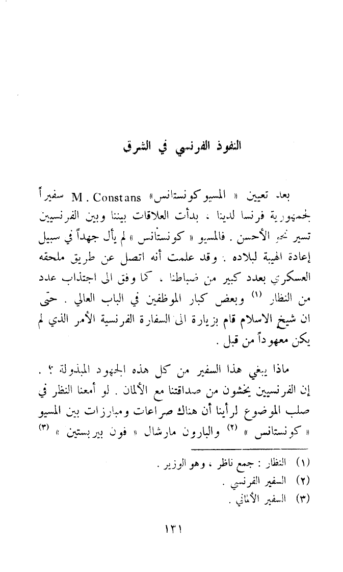 مَاذَا يَبْغِي هَذَا السفير من كل هَذِه الجهود المبذوله ان الفرنسيين يَخْشونَ من صداقتن مَعَ الألمان لَو أمعنا النّظر فِي صلب الْمَوْضُوع لرأينا أَن هُنَاكَ صراعات ومبارزات بَين المسيو (كونستانس (والبارون مارشال (فون بيربستين (