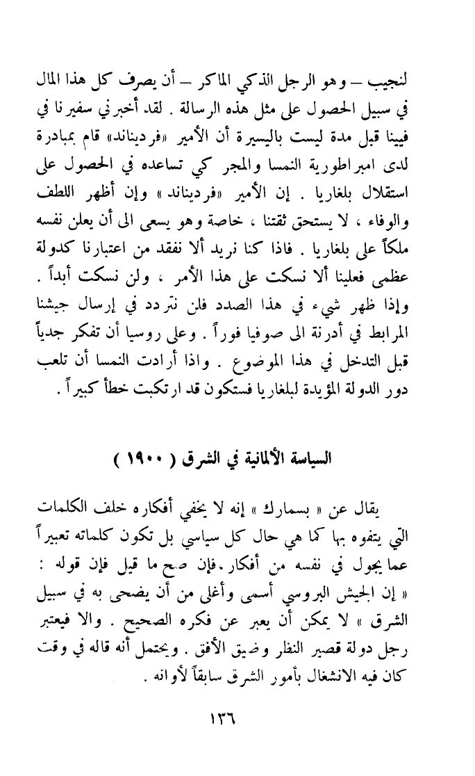 لنجيب وَهُوَ الرجل الذكي الماكر أَن يصرف كل هَذَا المَال فِي سَبِيل الْحُصُول على مثل هَذِه الرسَالَة لقد أَخْبرنِي سفيرنا فِي فيينا قبل مُدَّة لَيست باليسيرة أَن الامير (فرديناند (قَامَ بمبادرة لَدَى امبراطورية النمسا والمجر كي تساعده فِي الْحُصُول على اسْتِقْلَال بلغاريا ان الامير (فرديناند (وان أظهر اللطف وَالْوَفَاء لَا يسْتَحق ثقتنا خَاصَّة وَهُوَ يسْعَى الى أَن يعلن نَفسه ملكا على بلغاريا فَإِذا كُنَّا نُرِيد أَلا نفقد من اعتبارنا كدولة عظمى فعلينا أَلا نسكت على هَذَا الْأَمر وَلنْ نسكت أبدا واذا ظهر شىء فِي هَذَا الصدد فَلَنْ نتردد فِي إرْسَال جيشنا المرابط فِي أدرنة الى صوفيا فَوْرًا وعَلى روسيا أَن تفكر جديا قبل التدخل فِي هَذَا الْمَوْضُوع واذا أَرَادَت النمسا أَن تلعب دور الدولة المؤيدة لبلغاريا فستكون قد ارتكبت خطأ كَبِيرا