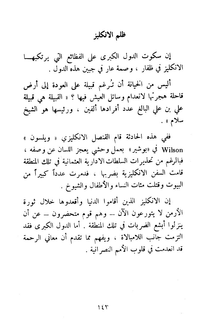 ان الانكليز الَّذين أَقَامُوا الدُّنْيَا وأقعدوها خلال ثورة الارمن لَا يتورعون الْآن وهم قوم متحضرون عَن أَن ينزلُوا أبشع الضربات فِي تِلْكَ المنطقة أما الدول الْكُبْرَى فقد التزمت جَانب اللامبالاة وَيفهم مِمَّا تقدم أَن مَعَاني الرَّحْمَة قد انعدمت فِي قُلُوب الامم النَّصْرَانِيَّة