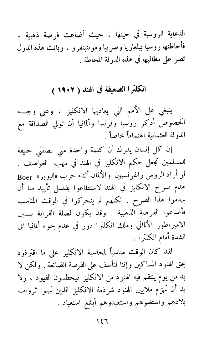 ان كل انسان يدْرك أَن كلمة وَاحِدَة مني بصفتي خَليفَة للْمُسلمين تجْعَل حكم الإنكليز فِي الْهِنْد فِي مهب العواصف لَو أَرَادَ الروس والفرنسيون والألمان أثْنَاء حَرْب (البوير (هدم صرح الإنكليز فِي الْهِنْد لاستطاعوا بِفضل تأييد منا أَن يهدموا هَذَا الصرح لكِنهمْ لم يتحركوا فِي الْوَقْت الْمُنَاسب فأضعوا الفرصة الذهبية وَقد يكون لصلة الْقَرَابَة بَين الامبراطور الألماني وَملك انكلترا دور فِي عدم لجوء المانيا الى الشدَّة أَمَام انكترا
