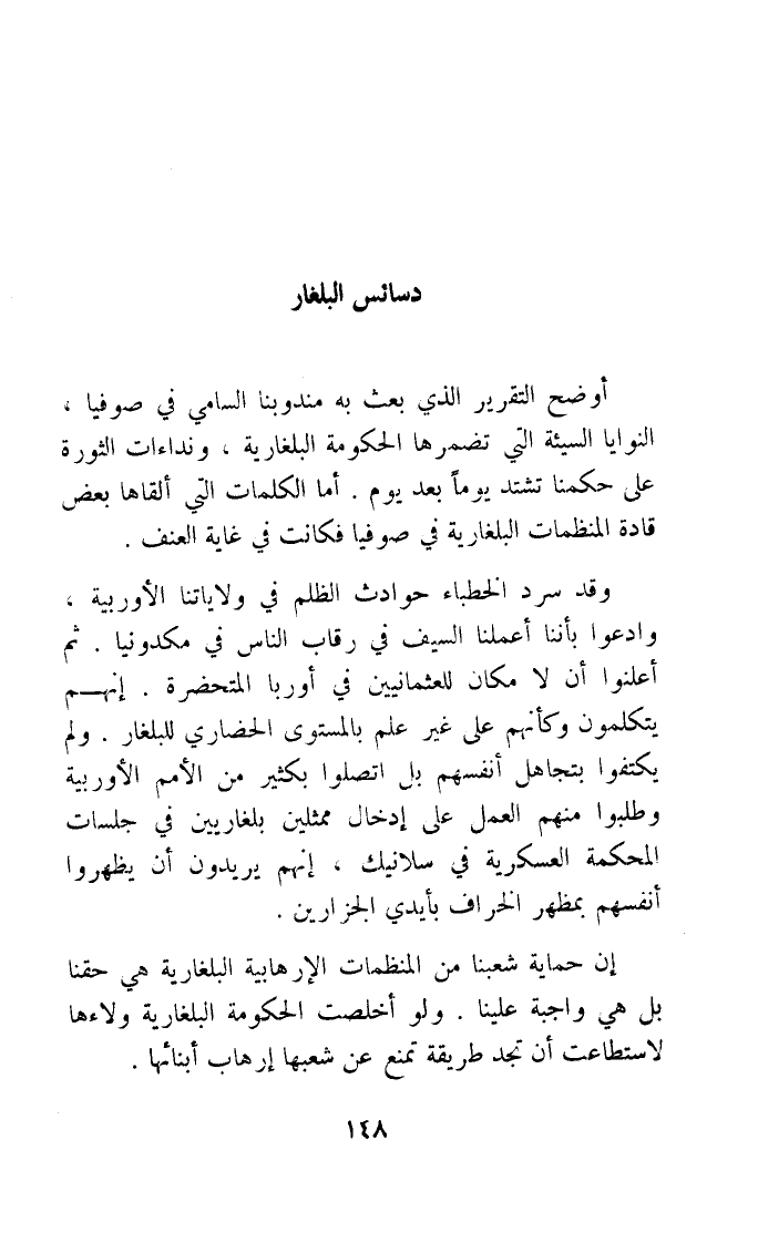ان حماية شعبنا من المنظمات الارهابية البلغارية هِيَ حَقنا بل هِيَ واجبه علينا وَلَو أخلصت الْحُكُومَة البلغارية ولاءها لاستطاعت أَن تَجِد طَريقَة تمنع عَن شعبها ارهاب أبنائها