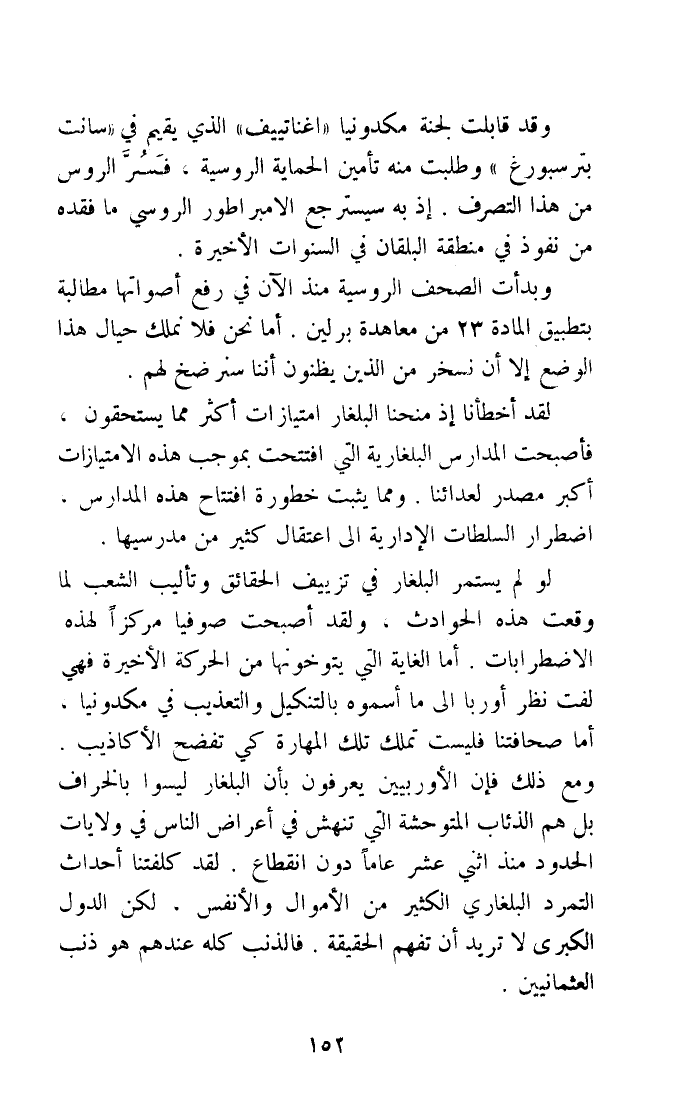 لَو لم يسْتَمر البلغار فِي تزييف الْحَقَائِق وتأليب الشّعب لما وَقعت هَذِه الْحَوَادِث وَلَقَد أَصبَحت صوفيا مركزا لهَذِهِ الاضطرابات أما الْغَايَة الَّتِي يتوخونها من الْحَرَكَة الاخيرة فَهِيَ لفت نظر أوربا الى مَا أسموه بالتنكيل والتعذيب فِي مكدونيا أما صحافتنا فَلَيْسَتْ تملك تِلْكَ المهارة كي تفضح الاكاذيب وَمَعَ ذَلِك فان الاوربيين يعْرفُونَ بِأَن البلغار لَيْسُوا بالخراف بل هم الذئاب المتوحشة الَّتِي تنهش فِي أَعْرَاض النَّاس فِي ولايات الْحُدُود مُنْذُ اثْنَي عشر عَاما دون انْقِطَاع لقد كلفتنا أَحْدَاث التمرد البلغاري الْكثير من الاموال والانفس لَكِن الدول الْكُبْرَى لَا تُرِيدُ أَن تفهم الْحَقِيقَة فالذنب كُله عِنْدهم هُوَ ذَنْب العثمانيين