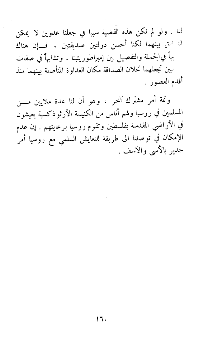 وثمة أَمر مُشْتَرك آخر وَهُوَ أَن لنا عدَّة ملايين من الْمُسلمين فِي روسيا وَلَهُم أنَاس من الْكَنِيسَة الارثوذكسية يعيشون فِي الاراضي المقدسة بفلسطين وَتقوم روسيا برعايتهم ان عدم الامكان فِي توصلنا الى طَريقَة للتعايش السّلمِيّ مَعَ روسيا أَمر جدير بالاسى والاسف