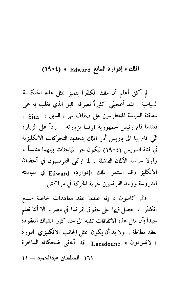 لم أكن أعلم أَن ملك انكلترا يتَمَيَّز بِمثل هَذِه الحنكة السياسية لقد أعجبني كثيرا تصرفه اللبق الذى تغلب بِهِ على دهاقنة السياسة المتغطرسين على ضفاف نهر (السِّين (فعندما قَامَ رَئِيس جمهورية فرنسا بزيارته ردا على الزِّيَارَة الَّتِي قَامَ بهَا الى باريس أَمر الْملك بتحديد التحركات الإنكليزية فِي قناة السويس (1904) ليَكُون جو المباحثات بَينهمَا مناسبا وَلَوْلَا سياسة الألمان الفاشلة لما ارتمى الفرنسيون فِي أحضان الانكليز وَقد اسْتمرّ الْملك (ادوارد (فِي سياسته المدروسة ووعد الفرنسيين حريَّة الْحَرَكَة فى مراكش