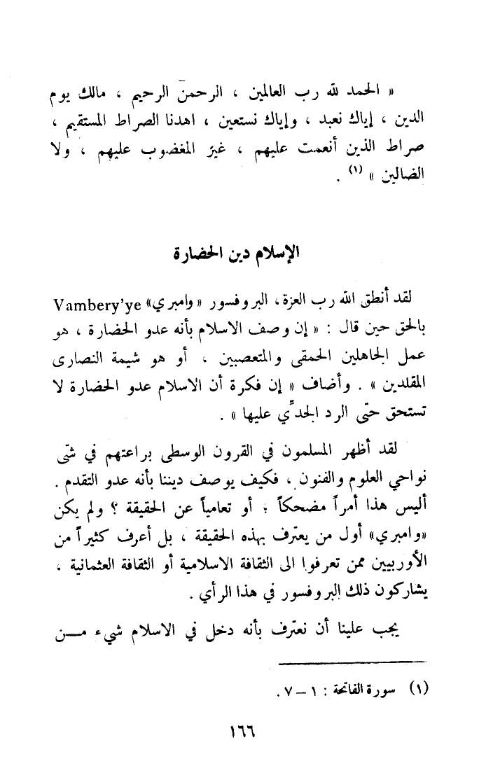 لقد أظهر الْمُسلمُونَ فِي الْقُرُون الْوُسْطَى براعتهم فِي شَتَّى نواحي الْعُلُوم والفنون فَكيف يُوصف ديننَا بِأَنَّهُ عَدو التَّقَدُّم أَلَيْسَ هَذَا أَمر مضحكا أَو تعاميا عَن الْحَقِيقَة وَلم يكن (وامبري (أول من يعْتَرف بِهَذِهِ الْحَقِيقَة بل أعرف كثيرا من الاوربيين مِمَّن تعرفوا الى الثقافة الاسلامية أَو الثقافة العثمانية يشاركون ذَلِك البروفسور فِي هَذَا الرَّأْي