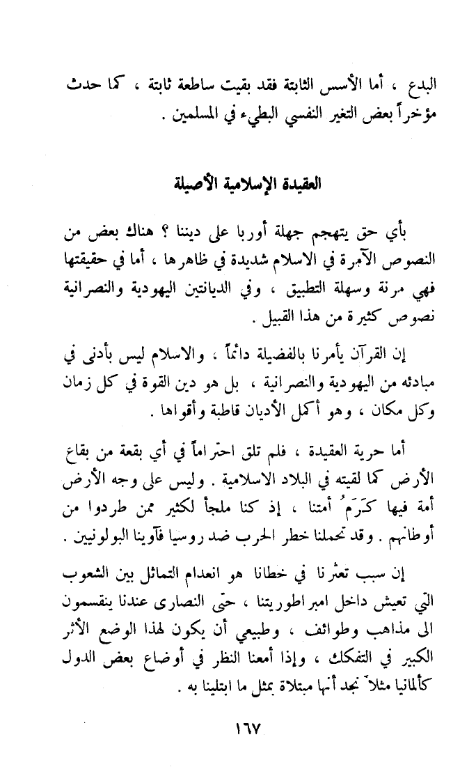 أما حريَّة العقيدة فَلم تلق احتراما فِي أَي بقْعَة من بقاع الارض كَمَا لَقيته فِي الْبِلَاد الاسلامية وَلَيْسَ على وَجه الارض أمة فِيهَا كرم أمتنَا اذ كُنَّا ملْجأ لكثير مِمَّن طردوا من أوطانهم وَقد تحملنا خطر الْحَرْب ضد روسيا فآوينا البولونيين