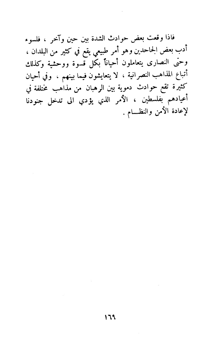 فاذا وَقعت بعض حوادث الشدَّة بَين حِين وَآخر فلسوء أدب بعض الجاحدين وَهُوَ أَمر طبيعي يَقع فِي كثير من الْبلدَانِ وَحَتَّى النَّصَارَى يتعاملون أَحْيَانًا بِكُل قسوة ووحشية وَكَذَلِكَ أَتبَاع الْمذَاهب النَّصْرَانِيَّة لَا يتعايشون فِيمَا بَينهم وَفِي أحيان كَثِيرَة تقع حوادث دموية بَين الرهبان من مَذَاهِب مُخْتَلفَة فِي أعيادهم بفلسطين الامر الَّذِي يُؤَدِّي الى تدخل جنودنا لاعادة الامن والنظام