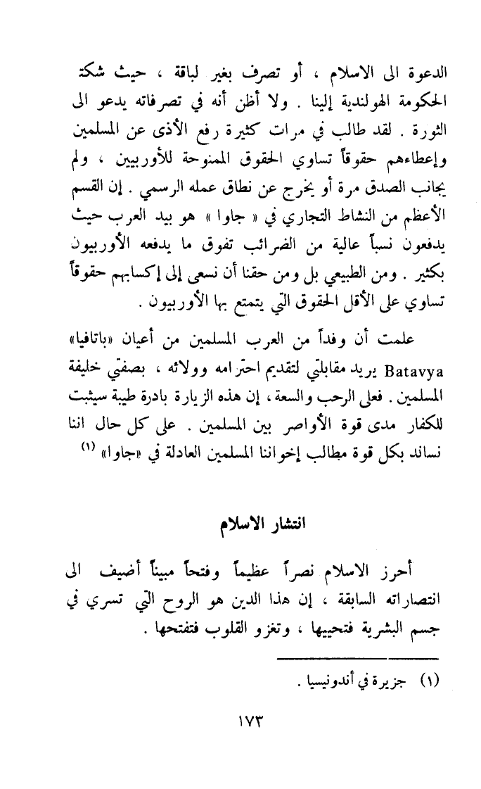 علمت أَن وَفْدًا من الْعَرَب الْمُسلمين من أَعْيَان (باتافيا (يُرِيد مقابلتي لتقديم احترامه وولائه بصفتي خَليفَة الْمُسلمين فعلى الرحب وَالسعَة ان هَذِه الزِّيَارَة بادرة طيبَة سيثبت للْكفَّار مدى قُوَّة الاواصر بَين الْمُسلمين على كل حَال اننا نساند بِكُل قُوَّة مطَالب اخواننا الْمُسلمين العادلة فِي (جاوا (