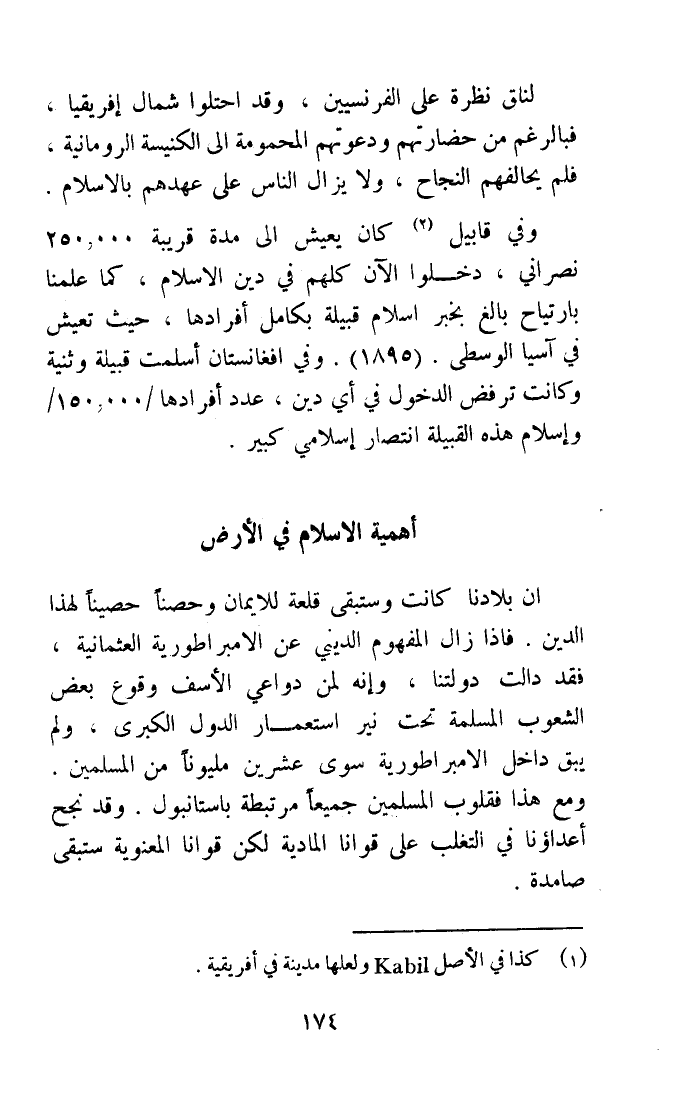 وَفِي قابيل كَانَ يعِيش الى مُدَّة قريبَة 250 000 نَصْرَانِيّ دخلُوا الْآن كلهم فِي دين الاسلام كَمَا علمنَا بارتياح بَالغ بِخَبَر اسلام قَبيلَة بكامل أفرادها حَيْثُ تعيش فِي آسيا الْوُسْطَى (1895) وَفِي افغانستان أسلمت قَبيلَة وثنية وَكَانَت ترفض الدُّخُول فِي أَي دين عدد أفرادها 150 000 واسلام هَذِه الْقَبِيلَة انتصار اسلامي كَبِير