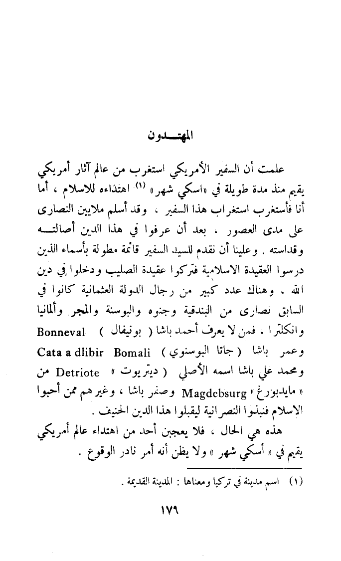 علمت أَن السفير الامريكي اسْتغْرب من عَالم آثَار أمريكي يُقيم مُنْذُ مُدَّة طَوِيلَة فِي (اسكي شهر (اهتداءه للاسلام أما أَنا فأستغرب استغراب هَذَا السفير وَقد أسلم ملايين النَّصَارَى على مدى العصور بعد أَن عرفُوا فِي هَذَا الدّين أصالتة وقداسته وعلينا أَن نقدم للسَّيِّد السفير قَائِمَة مُطَوَّلَة بأسماء الَّذين درسوا العقيدة الاسلامية فتركوا عقيدة الصَّلِيب ودخلوا فِي دين الله وَهُنَاكَ عدد كَبِير من رجال الدولة العثمانية كَانُوا فِي السَّابِق نَصَارَى من البندقية وجنوه والبوسنة والمجر وألمانيا وانكلترا فَمن لَا يعرف أَحْمد باشا (بونيفال) وَعمر باشا (جاتا البوسنوي) وَمُحَمّد عَليّ باشا اسْمه الاصلي (ديتريوت) من (مايدبورغ (وصقر باشا وَغَيرهم مِمَّن أَحبُّوا الاسلام فنبذوا النَّصْرَانِيَّة ليقبلوا هَذَا الدّين الحنيف