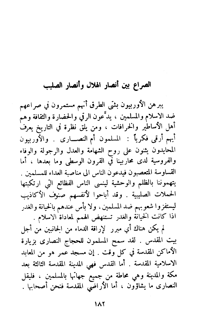 يبرهن الاوربيون بشتى الطّرق أَنهم مستمرون فِي صراعهم ضد الاسلام وَالْمُسْلِمين يدعونَ الرقي والحضارة والثقافة وهم أهل الاساطير والخرافات وَمن يلق نظرة فِي التَّارِيخ يعرف أَيهمْ أرقي فكريا الْمُسلمُونَ أم النَّصَارَى والاوربيون المحايدون يثنون على روح الشهامة وَالْعدْل والرجولة وَالْوَفَاء والفروسية لَدَى محاربينا فِي الْقُرُون الْوُسْطَى وَمَا بعْدهَا أما القساوسة المتعصبون فَيدعونَ النَّاس الى مناصبة العداء للْمُسلمين يتهموننا بالظلم والوحشية لينسى النَّاس الفظائع الَّتِى ارتكبتها الحملات الصليبية وَقد أباحوا لانفسهم صنوف الاكاذيب ليستفزوا شعوبهم ضد الْمُسلمين وَلَا بَأْس عِنْدهم بالخيانة والغدر اذا كَانَت الْخِيَانَة والغدر تستنهض الهمم لمعاداة الاسلام