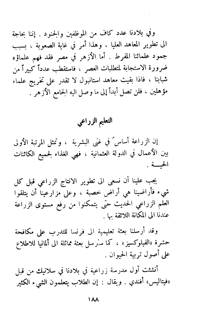 وَفِي بِلَادنَا عدد كَاف من الموظفين والجنود اننا بحاجة الى تطوير الْمعَاهد الْعليا وَهَذَا أَمر فِي غَايَة الصعوبة بِسَبَب جمود عُلَمَائِنَا المفرط أما الازهر فِي مصر فقد فهم علماؤه ضَرُورَة الاستجابة لمتطلبات الْعَصْر فاستقطب عددا كَبِيرا من شبابنا فاذا بقيت معاهد استانبول لَا تقدر على تَخْرِيج عُلَمَاء مؤهلين فَلَنْ تصل أبدا الى مَا وصل اليه الْجَامِع الازهر