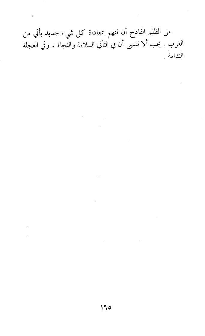 من الظُّلم الفادح أَن نتهم بمعاداة كل شىء جَدِيد يَأْتِي من الغرب يجب أَلا ننسى أَن فِي التأني السَّلامَة والنجاة وَفِي العجلة الندامة