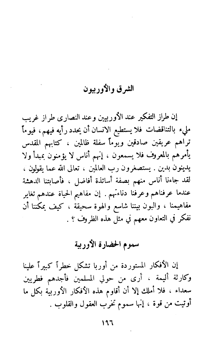 ان طراز التفكير عِنْد الاوربيين وَعند النَّصَارَى طراز غَرِيب ملىء بالتناقضات فَلَا يَسْتَطِيع الانسان أَن يحدد رَأْيه فيهم فيوما تراهم عريقين صَادِقين وَيَوْما سفلَة ظالمين كِتَابهمْ الْمُقَدّس يَأْمُرهُم بِالْمَعْرُوفِ فَلَا يسمعُونَ انهم أنَاس لَا يُؤمنُونَ بمبدأ وَلَا يدينون بدين يستصغرون رب الْعَالمين تَعَالَى الله عَمَّا يَقُولُونَ لقد جَاءَنَا أنَاس مِنْهُم بِصفة أساتذة أفاضل فأصابتنا الدهشة عِنْدَمَا عرفناهم وعرفنا دناءتهم ان مفاهيم الْحَيَاة عِنْدهم تغاير مفاهيمنا والبون يننا شاسع والهوة سحيقة كَيفَ يمكننا أَن نفكر فِي التعاون مَعَهم فِي مثل هَذِه الظروف