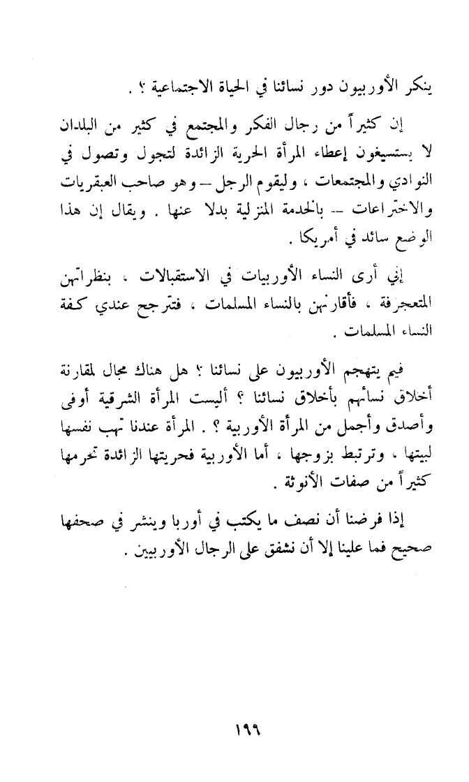 فيمَ يتهجم الاوربيون على نسائنا هَل هُنَاكَ مجَال لمقارنة أَخْلَاق نِسَائِهِم بأخلاق نسائنا أليست الْمَرْأَة الشرقية أوفى وأصدق وأجمل من الْمَرْأَة الاوربية الْمَرْأَة عندنَا تهب نَفسهَا لبيتها وترتبط بزوجها أما الاوربية فحريتها الزَّائِدَة تحرمها كثيرا من صِفَات الانوثه
