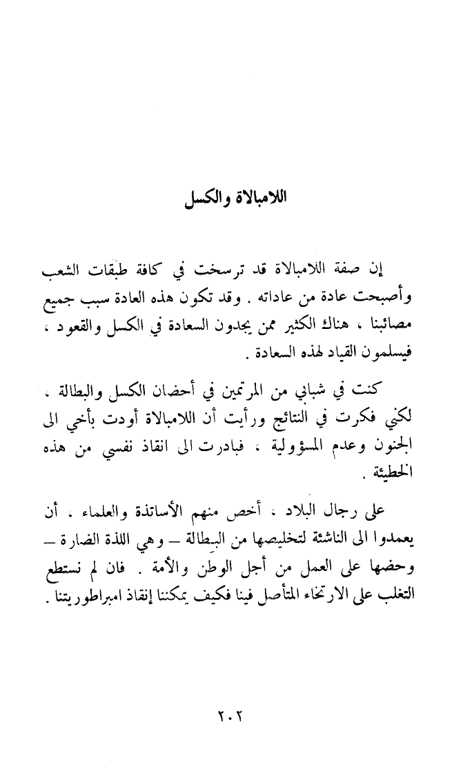 ان صفة اللامبالاة قد ترسخت فِي كَافَّة طَبَقَات الشّعب وأصبحت عَادَة من عاداته وَقد تكون هَذِه الْعَادة سَبَب جَمِيع مصائبنا هُنَاكَ الْكثير مِمَّن يَجدونَ السَّعَادَة فِي الكسل وَالْقعُود فيسلمون القيادة لهَذِهِ السَّعَادَة