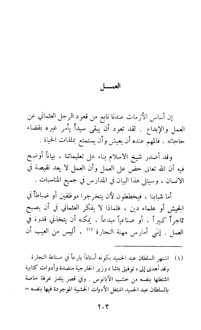 أما شبابنا فيخططون لَان يتخرجوا موظفين أَو ضباطا فِي الْجَيْش أَو عُلَمَاء دين فلماذا لَا يفكر العثماني فِي أَن يصبح تَاجِرًا كَبِيرا أَو صناعيا مبدعا يُمكنهُ أَن يتخذني قدوة فِي الْعَمَل انني أمارس مهنة النجارة أَلَيْسَ من الْعَيْب أَن