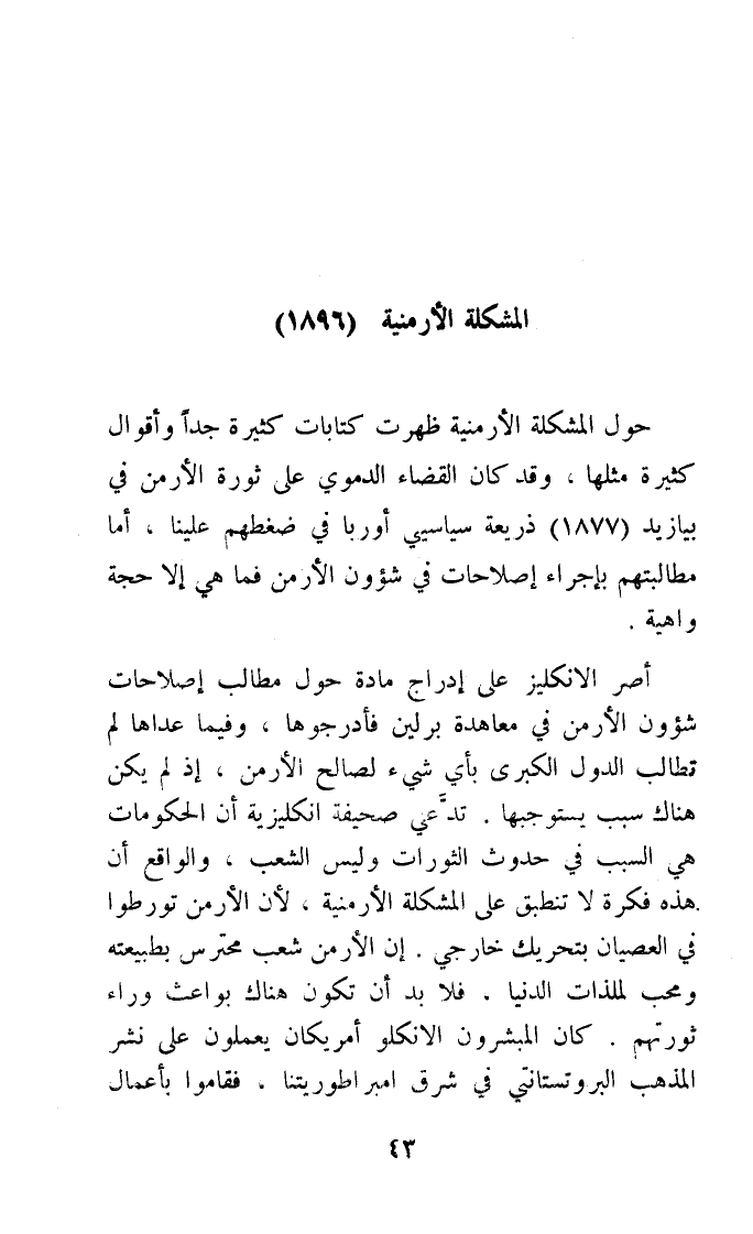 حول المشكلة الأرمنية ظَهرت كتابات كَثِيرَة جدا وأقوال كَثِيرَة مثلهَا وَقد كَانَ الْقَضَاء الدموى على ثورة الأرمن فِي بيازيد (1877) ذَرِيعَة سياسيى اوربا فِي ضغطهم علينا أما مطالبتهم باجراء إصلاحات فِي شؤون الأرمن فَمَا هى إِلَّا حجَّة واهية