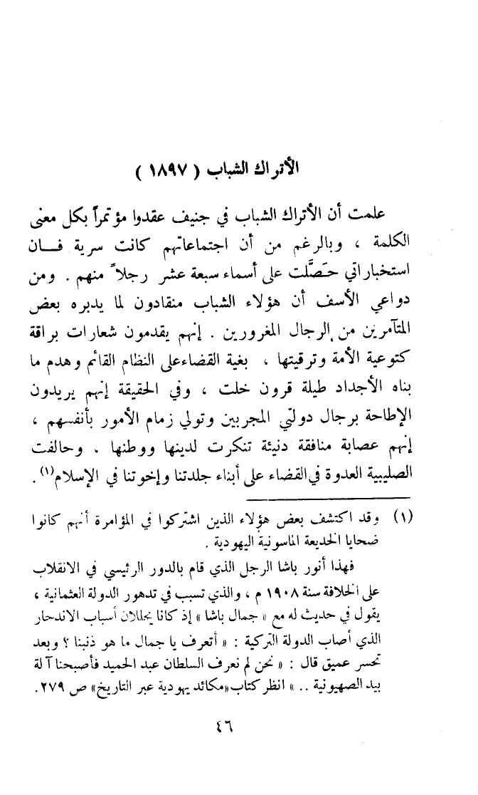 علمت أَن الاتراك الشَّبَاب فِي جنيف عقدوا مؤتمرا بِكُل معنى الْكَلِمَة وبالرغم من أَن اجتماعاتهم كَانَت سَرِيَّة فَإِن استخباراتي حصلت على أَسمَاء سَبْعَة عشر رجلا مِنْهُم وَمن دواعى الاسف أَن هَؤُلَاءِ الشَّبَاب منقادون لما يدبره بعض المتآمرين من الرِّجَال المغرورين انهم يقدمُونَ شعارات براقة كتوعية الْأمة وترقيتها بغية الْقَضَاء على النظام الْقَائِم وَهدم مَا بناه الاجداد طيلة قُرُون خلت وَفِي الْحَقِيقَة انهم يُرِيدُونَ الاطاحة بِرِجَال دولتى المجربين وتولي زِمَام الامور بِأَنْفسِهِم إِنَّهُم عِصَابَة منافقة دنيئة تنكرت لدينها ووطنها وحالفت الصليبية العدوة فِي الْقَضَاء على ابناء جلدتنا واخواتنا فِي الاسلام