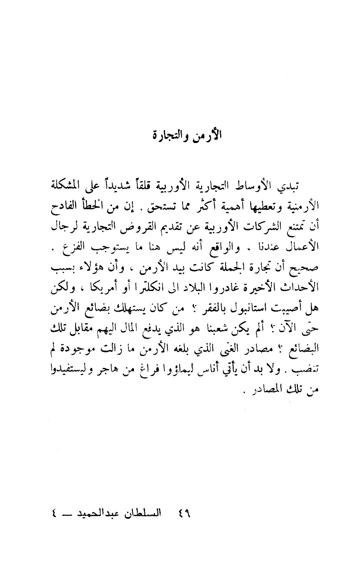 تبدى الاوساط التجارية الاوربية قلقا شَدِيدا على المشكلة الأرمنية وتعطيها أهمية أَكثر مِمَّا تسْتَحقّ إِن من الْخَطَأ الفادح أَن تمْتَنع الشركات الاوربية عَن تَقْدِيم القروض التجارية لرجال الاعمال عندنَا وَالْوَاقِع انه لَيْسَ هُنَا مَا يسْتَوْجب الْفَزع صَحِيح أَن تِجَارَة الْجُمْلَة كَانَت بيد الأرمن وان هَؤُلَاءِ بِسَبَب الاحداث الاخيرة غادروا الْبِلَاد إِلَى انكلترا أَو أمريكا وَلَكِن هَل أُصِيبَت استانبول بالفقر من كَانَ يستهلك بضائع الأرمن حَتَّى الْآن ألم يكن شعبنا هُوَ الَّذِي يدْفع المَال إِلَيْهِم مُقَابل تِلْكَ البضائع مصَادر الْغنى الَّذِي بلغه الأرمن مَا زَالَت مَوْجُودَة لم تنضب وَلَا بُد أَن يأتى اناس ليملؤوا فرَاغ من هَاجر وليستفيدوا من تِلْكَ المصادر