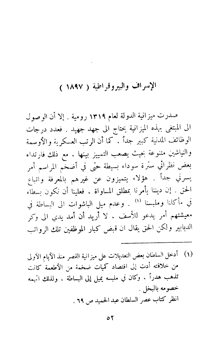 صدرت ميزانية الدولة لعام 1319 رُومِية الا أَن الْوُصُول إِلَى المبتغى بِهَذِهِ الميزانية يحْتَاج إِلَى جهد جهيد فعدد دَرَجَات الْوَظَائِف المدنية كَبِير جدا كَمَا أَن الرتب العسكرية والاوسمة والنياشين متنوعة بِحَيْثُ يصعب التَّمْيِيز بَينهَا مَعَ ذَلِك فارتداء بعض نظرائي ستْرَة سَوْدَاء بسيطة حَتَّى فِي أضخم المراسم أَمر يسرنى جدا هَؤُلَاءِ يتميزون عَن غَيرهم بالمعرفة وَاتِّبَاع الْحق أَن ديننَا يَأْمُرنَا بِمُطلق الْمُسَاوَاة فعلينا أَن نَكُون بسطاء فِي مأكلنا وملبسنا وَعدم ميل الباشوات إِلَى البساطة فِي معيشتهم أَمر يَدْعُو للاسف لَا أُرِيد أَن أمد يدى إِلَى وكر الدبابير وَلَكِن الْحق يُقَال أَن قبض كبار الموظفين تِلْكَ الرَّوَاتِب