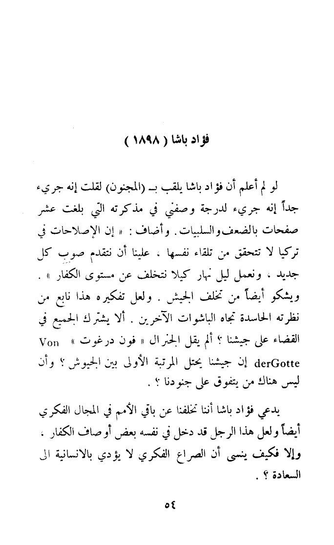 لَو لم أعلم أَن فؤاد باشا يلقب ب (الْمَجْنُون) لَقلت انه جرىء جدا انه جرىء لدرجة وصفنى فِي مذكرته الَّتِي بلغت عشر صفحات بالضعف والسلبيات وأضاف (أَن الإصلاحات فِي تركيا لَا تتَحَقَّق من تِلْقَاء نَفسهَا علينا أَن نتقدم صوب كل جَدِيد ونعمل ليل نَهَار كَيْلا نتخلف عَن مستوى الْكفَّار (ويشكو أَيْضا من نخلف الْجَيْش وَلَعَلَّ تفكيره هَذَا نابع من نظرته الحاسدة تجاه الباشوات الآخرين أَلا يشْتَرك الْجَمِيع فِي الْقَضَاء على جيشنا الم يقل الجنرال (فون درغوت (أَن جيشنا يحتل الْمرتبَة الاولى بَين الجيوش وان لَيْسَ هُنَاكَ من يتفوق على جنودنا