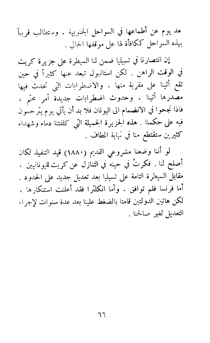 لَو اننا وَضعنَا مشروعي الْقَدِيم (1880) قيد التَّنْفِيذ لَكَانَ أصلح لنا فَكرت فِي حِينه فِي التنازل عَن كريت لليونانيين مُقَابل السيطرة التَّامَّة على تسيليا بعد تَعْدِيل جَدِيد على الْحُدُود أما فرنسا فَلم توَافق وَأما انكلترا فقد أعلنت استنكارها لَكِن هَاتين الدولتين قامتا بالضغط علينا بعد عدَّة سنوات لإجراء التَّعْدِيل لغير صالحنا