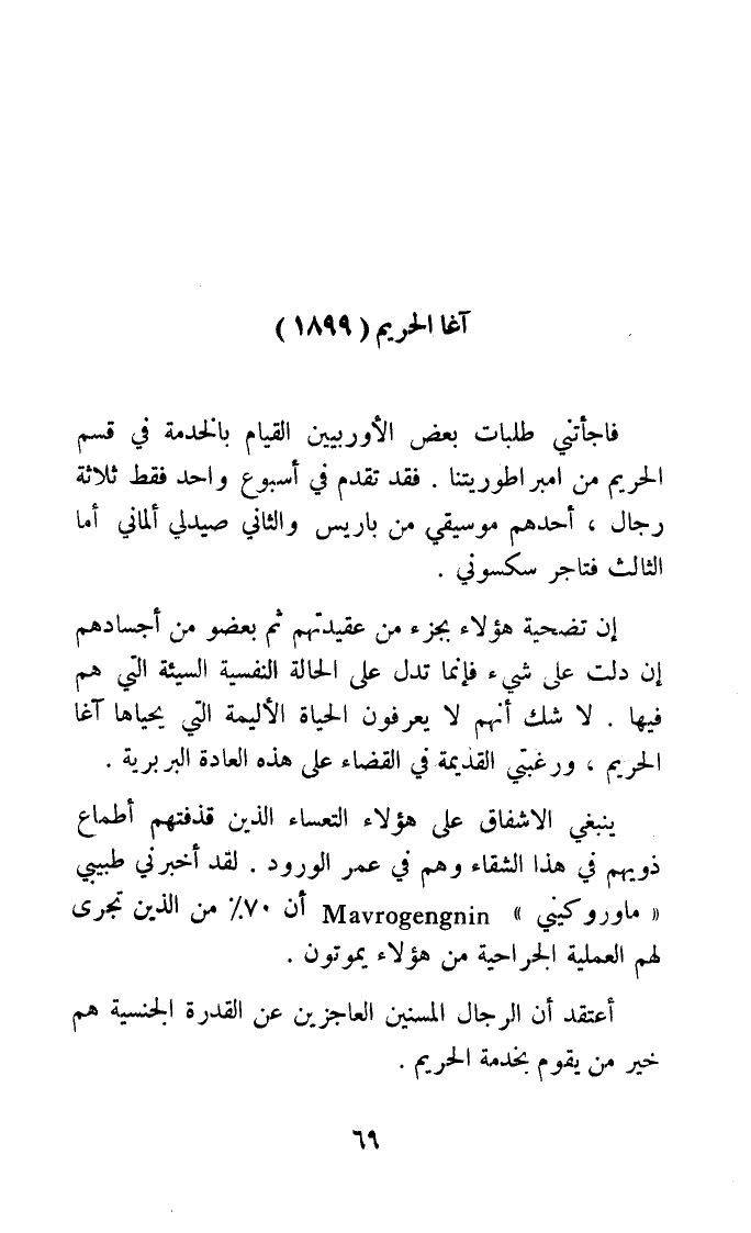 فاجأتنى طلبات بعض الاوربيين الْقيام بِالْخدمَةِ فِي قسم الْحَرِيم من امبراطوريتنا فقد تقدم فِي أُسْبُوع وَاحِد فَقَط ثَلَاثَة رجال أحدهم موسيقى من باريس والثانى صيدلى ألمانى أما الثَّالِث فتاجر سكسوني