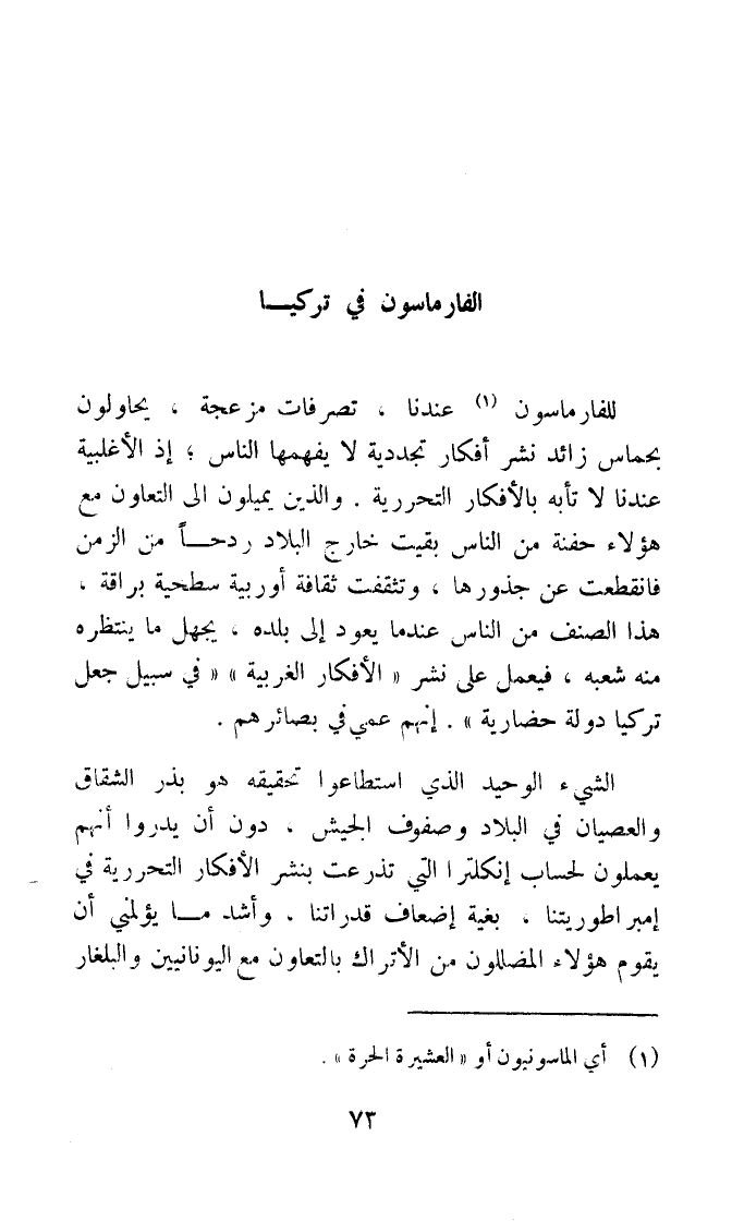 للفارماسون عندنَا تَصَرُّفَات مزعجة يحاولون بحماس زَائِد نشر أفكار تجددية لَا يفهمها النَّاس اذ الاغلبية عندنَا لَا تأبه بالافكار التحررية وَالَّذين يميلون إِلَى التعاون مَعَ هَؤُلَاءِ حفْنَة من النَّاس بقيت خَارج الْبِلَاد ردحا من الزَّمن فَانْقَطَعت عَن جذورها وتثقفت ثقافة أوربية سطحية براقة هَذَا الصِّنْف من النَّاس عِنْدَمَا يعود إِلَى بَلَده يجهل مَا ينتظره مِنْهُ شعبه فَيعْمل على نشر (الأفكار الغربية (فِي سَبِيل جعل تركيا دولة حضارية (إِنَّهُم عمي فِي بصارئهم