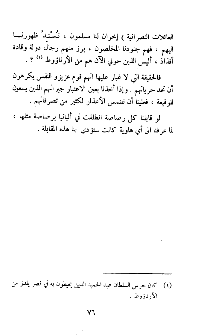 العائلات النَّصْرَانِيَّة) اخوان لنا مُسلمُونَ نسند ظُهُورنَا اليهم فهم جنودنا المخلصون برز مِنْهُم رجال دولة وقادة أفذاذ أَلَيْسَ الَّذين حولى الأن هم من الارناؤوط