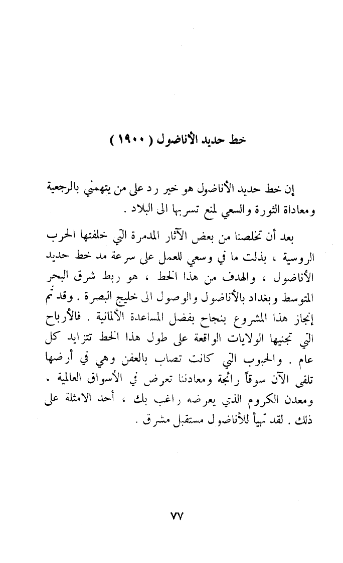 بعد أَن تخلصنا من بعض الْآثَار المدمرة الَّتِي خلفتها الْحَرْب الروسية بذلت مَا فِي وسعى للْعَمَل على سرعَة مد خطّ حَدِيد الأناضول والهدف من هَذَا الْخط هُوَ ربط شَرق الْبَحْر الْمُتَوَسّط وبغداد بالاناضول والوصول إِلَى خليج الْبَصْرَة وَقد تمّ انجاز هَذَا الْمَشْرُوع بنجاح بِفضل المساعدة الألمانية فالارباح الَّتِي تجنيها الولايات الْوَاقِعَة على طول هَذَا الْخط تتزايد كل عَام والحبوب الَّتِي كَانَت تصاب بالعفن وهى فِي أرْضهَا تلقى الْآن سوقا رائجه ومعادننا تعرض فِي الاسواق العالمية ومعدن الكروم الَّذِي يعرضه رَاغِب بك أحد الامثلة على ذَلِك لقد تهَيَّأ للأناضول مُسْتَقْبل مشرق