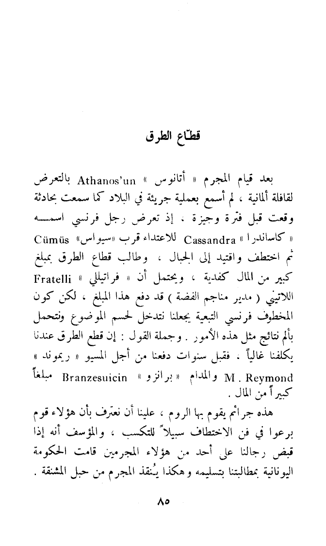 بعد قيام المجرم (أتانوس (بالتعرض لقافلة ألمانية لم اسْمَع بعملية جريئة فِي الْبِلَاد كَمَا سَمِعت بحادثة وَقعت قبل فَتْرَة وجيزة اذ تعرض رجل فرنسي اسْمه (كاساندرا (للإعتداء قرب (سيواس (ثمَّ اخْتَطَف واقتيد إِلَى الْجبَال وطالب قطاع الطّرق بمبلغ كَبِير من المَال كفدية وَيحْتَمل أَن (فراتيللي (اللاتيني (مدير مناجم الْفضة) قد دفع هَذَا الْمبلغ لَكِن كَون المخطوف فرنسي التّبعِيَّة يجعلنا نتدخل لحسم الْمَوْضُوع ونتحمل بألم نتائج مثل هَذِه الْأُمُور وَجُمْلَة القَوْل أَن قطع الطّرق عندنَا يكلفنا غاليا فَقبل سنوات دفعنَا من أجل المسيو (ريموند (والمدام (برانزو (مبلغا كَبِيرا من المَال