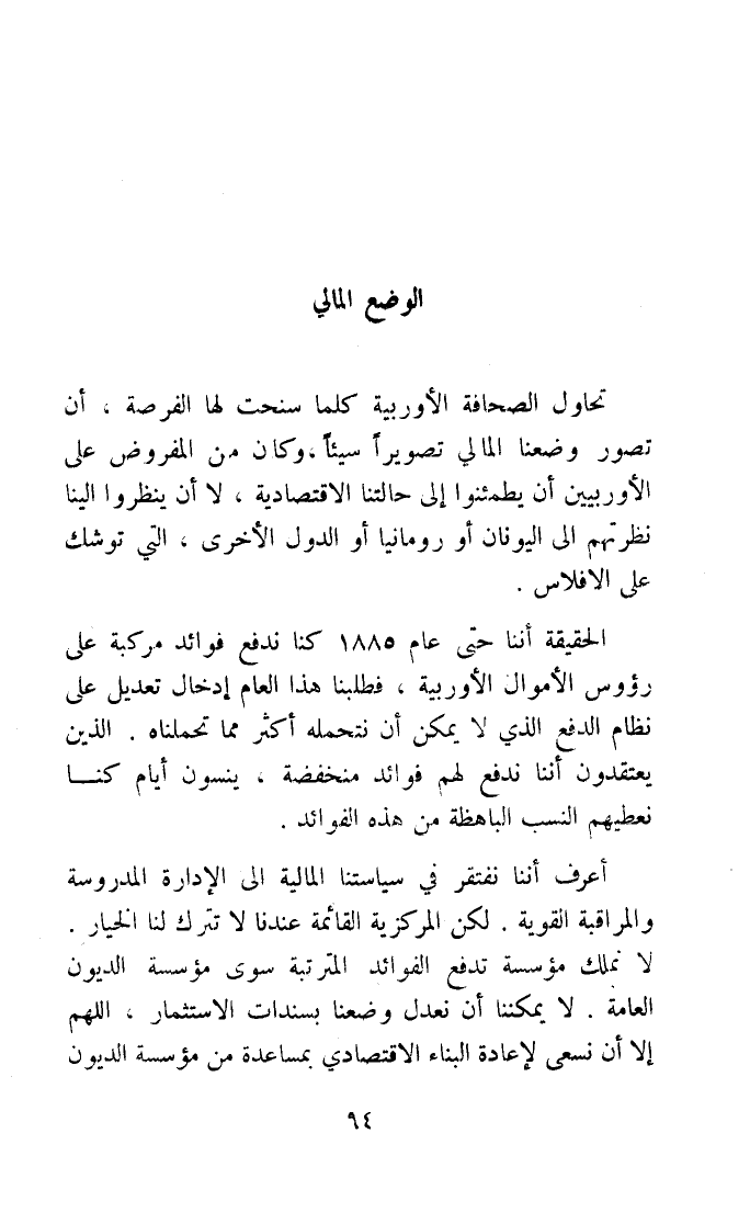 الْحَقِيقَة اننا حَتَّى عَام 1885 كُنَّا ندفع فَوَائِد مركبة على رُؤُوس الاموال الأوربية فطلبنا هَذَا الْعَام ادخال تَعْدِيل على نظام الدّفع الَّذِي لايمكن أَن نتحملة أَكثر مِمَّا تحملناه الَّذين يَعْتَقِدُونَ اننا ندفع لَهُم فَوَائِد منخفضة ينسون أَيَّام كُنَّا نعطيهم النّسَب الباهظة من هَذِه الْفَوَائِد
